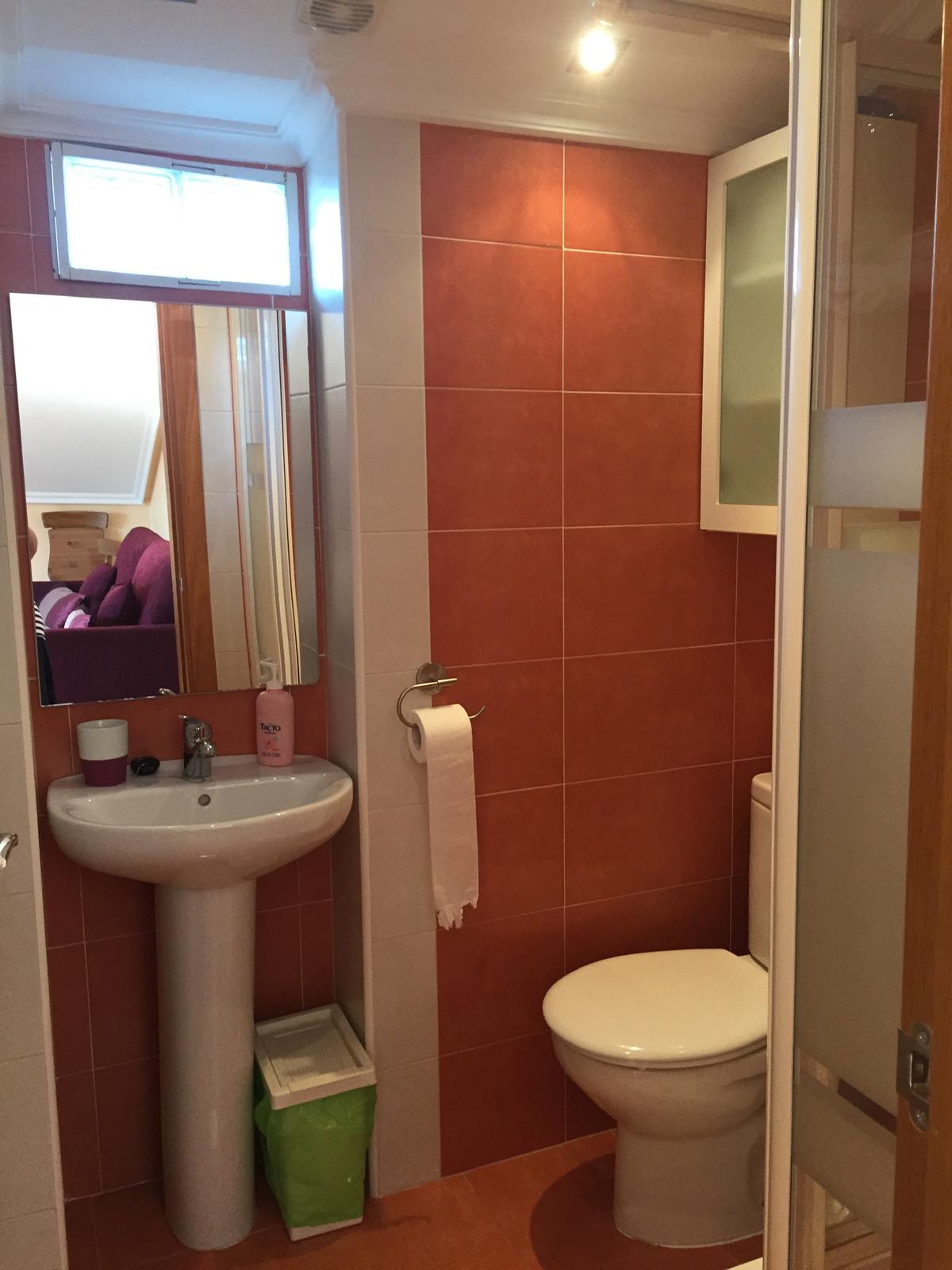 Cocina completamente equipada y baño con plato de ducha.